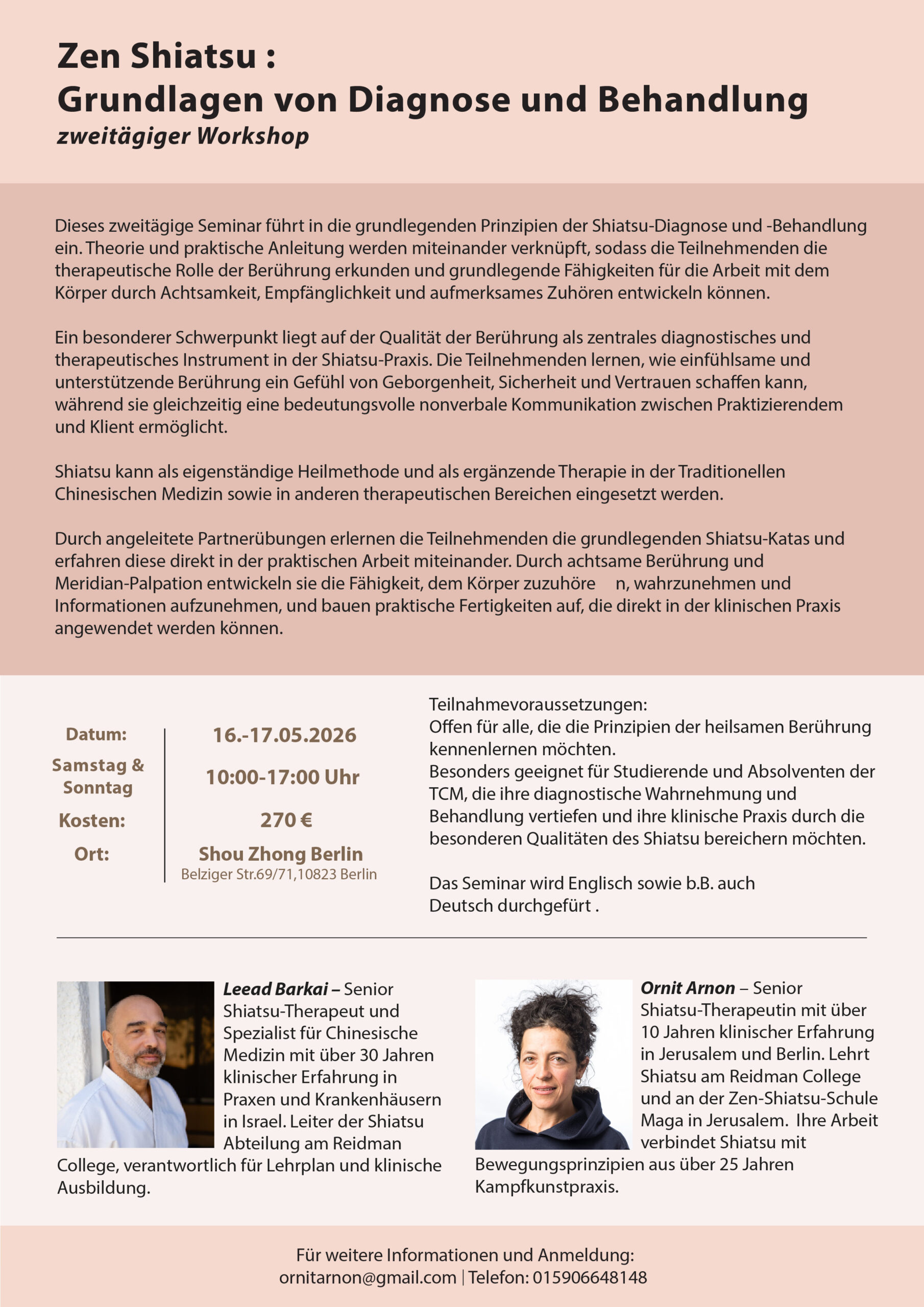 Ornit Arnon – Senior Shiatsu-Therapeutin mit über 10 Jahren klinischer Erfahrung in Jerusalem und Berlin. Lehrt Shiatsu am Reidman College und an der Zen-Shiatsu-Schule Maga in Jerusalem.